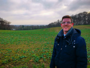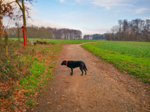 Wir wandern weiter durch den Wald und dieser wechselt sich mit freiem Blicken auf die Landschaft und mit dichten Waldbestand ab. Achtung ab hier beginnt Naturschutzgebiet und der Hund muss an die Leine. Der Weg nennt sich Römerweg und markiert die Grenze zwischen Düsseldorf und Erkrath. Nun laufen wir auf dem Höhenweg weiter bis zu einer Schutzhütte und einer Wegekreuzung, an der wir nach links schwenken und bergab laufen. Kurz bevor es wieder in den Wald geht, braucht Oliver eine kleine Pause auf einer Ruhebank. Von hier hat man einen schönen Blick auf Erkrath. Ayka genießt die Runde und schnüffelt sich durch die Wiesen.